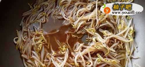 2原锅倒入豆芽菜翻炒,加入水与蘑菇酱,盖上锅盖以中小火煮至水滚。