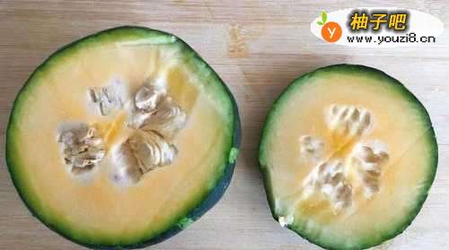2切去顶部,并将南瓜籽用勺子挖掉。
