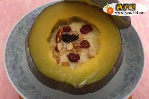 6出锅,放上一点坚果碎,营养均匀又制作简单的南瓜蒸蛋就可以开吃的,超级适合当早饭的~