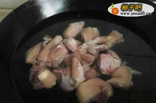 4锅里倒适量冷水,把猪蹄放进去开大火煮沸,撇去血水