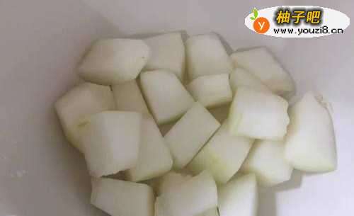 7把冬瓜去皮洗净,切成小方块,连同香菇、压好的猪蹄一起放入砂锅,开小火慢炖半小时