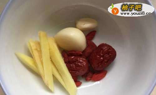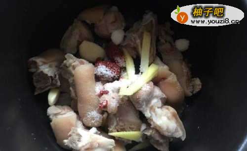 6把猪蹄、蒜、红枣、枸杞、生姜倒进高压锅,加入适量盐和热水,压半小时