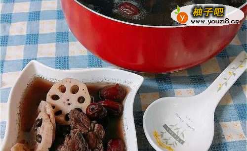 莲藕排骨汤可清热消痰、补血养颜,加入一些黑豆同食,更加起到乌须黑发、补肾强筋、防老抗衰的效果。