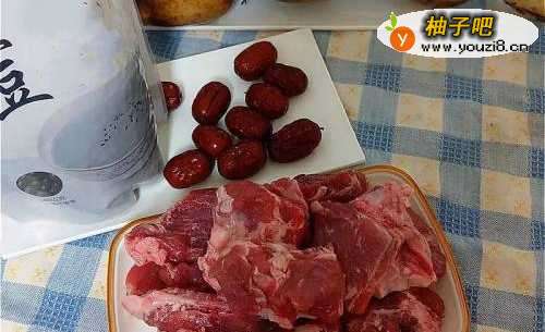 5将泡好水的黑豆和洗净的红枣、姜片及汆烫过的排骨放入锅中,加八分满的水,开大火煮滚后,放入藕片转中小火焖煮40分钟。