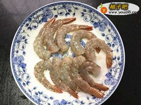 2虾去壳去虾线,背部剖开,加入少量食盐,淀粉,少量食用油腌制20分钟;