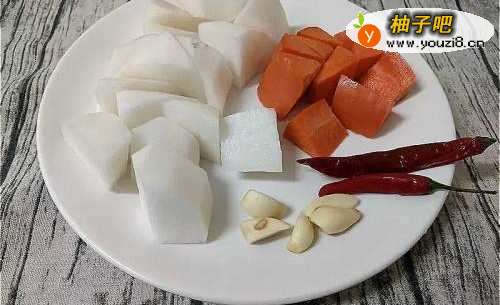2红萝卜、白萝卜切滚刀块,蒜去头尾去膜,红辣椒洗净备用