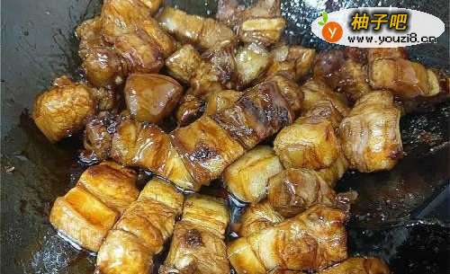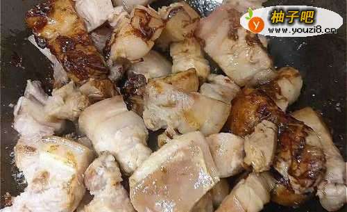 4利用煸过五花肉的锅子下色拉油和砂糖炒成酱色,酱色炒好后将煸过的五花肉放入拌炒一下