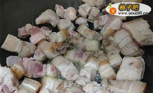 3将锅子烧热后将切好的五花肉放入锅中干煸上色,再盛出备用