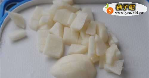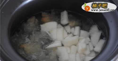 5炖银耳的空档,把梨去皮切块,两小时四十分左右,银耳汤汁稍有粘稠,倒入梨块