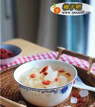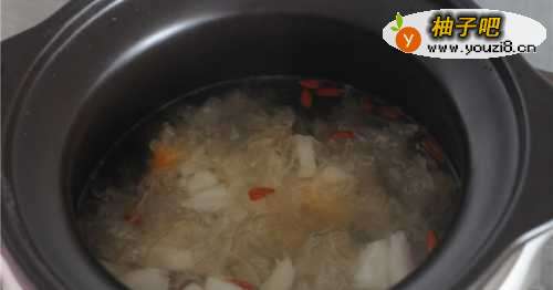 6稍微搅拌,继续炖15分钟,开盖放入冰糖,加入枸杞