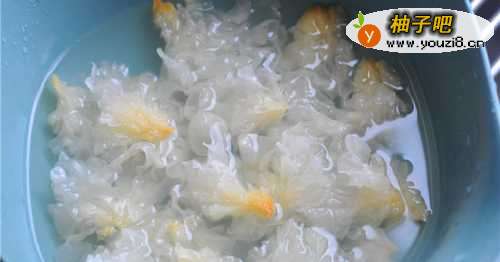 3剪去蒂,撕成小朵,银耳倒入锅中,倒入足量冷水