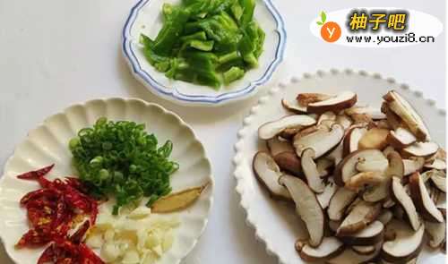 1、先将青椒、红干椒、香菇等辅助食材洗干净,然后用刀切成大小均匀的片,放置碟中备用。