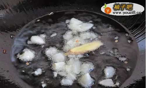 44、锅烧热,放入食用油,等油温至五六成的样子,放入姜片、蒜,炸出香味捞出姜片和蒜放到一边。
