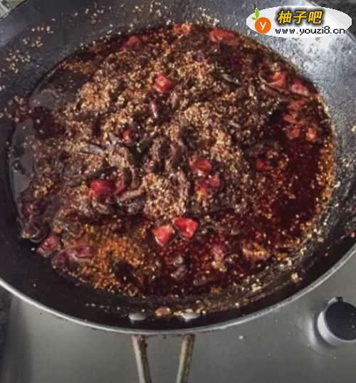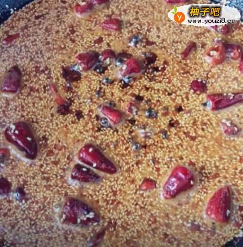 5现在我们开始来炸料,油温不要太高,小火放入干辣椒,芝麻,香料,辣椒面炒2分钟,