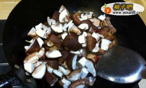 8把香菇切成瓣,放进锅里翻炒均匀