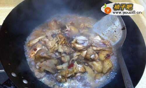 6炒到鸡肉颜色变黄、肉质紧致,加入老抽