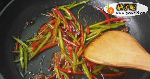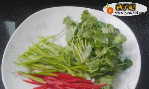 22.香菜切成数段,(可以根据自己喜好)青椒红椒也切成细丝