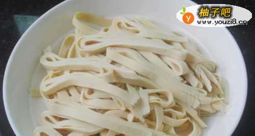 33.豆皮切成长条丝,另外放在一个干净的盘子中。烧一锅水。