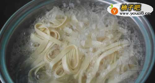 44.等到水烧开之后。放入豆皮丝,片刻(时间不要太长,大概1分钟不到,不然豆皮就化了)捞出来沥干。