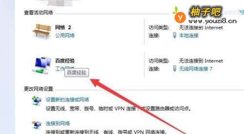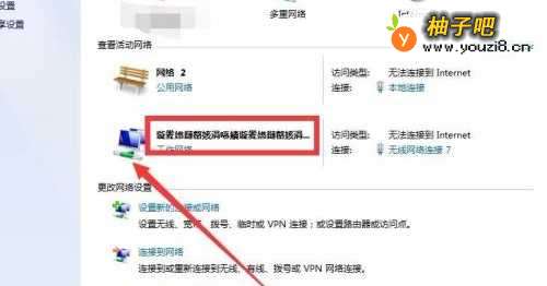3进入到【网络和共享中心】选项的具体界面后,小伙伴们可以看到自己的宽带名称确实发生了乱码的情况,此时我们双击下图箭头所指处的标识。