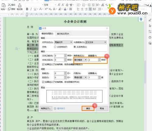 4在缩进栏,选择特殊格式为【首先缩进】,度量值【2字符】,点击【确定】即可。