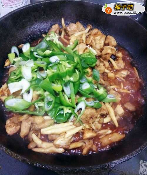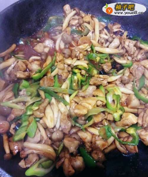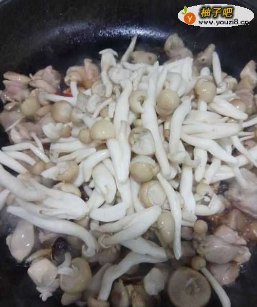 6鸡肉炒炒熟后,放入海鲜菇进行翻炒。