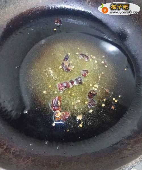 3取一个炒锅,然后放入三勺食用油,之后用中火加热后放入干辣椒爆香。