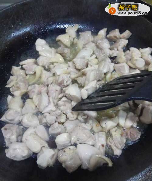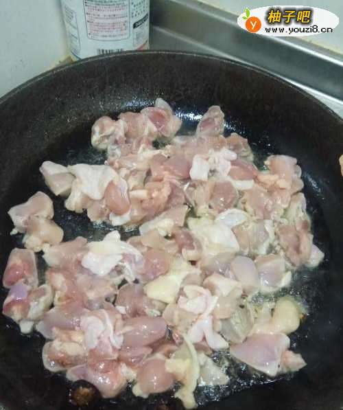 4爆香后,放入切好的鸡肉丁。进行翻炒。记得要频繁翻炒,以免糊锅。