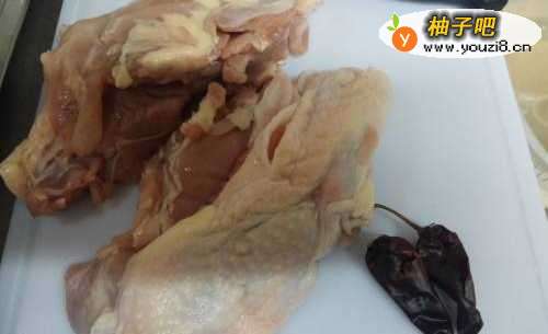 2自己家吃鸡肉我就没有去皮,直接切成了小块(大约2厘米大小的方块),海鲜菇清洗干净,大葱洗净后切丝,青辣椒洗净去籽后切丝,干辣椒洗净后切成小段。