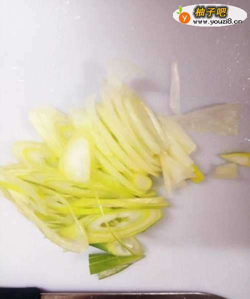 7翻炒2-3分钟后,放入青椒丝和葱丝继续翻炒。