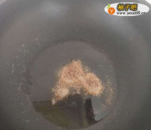 5热锅倒油,油热后,小火放入半茶匙的花椒粉爆香,然后再加入辣椒碎、姜丝、大葱丝一起中火煸炒20秒。