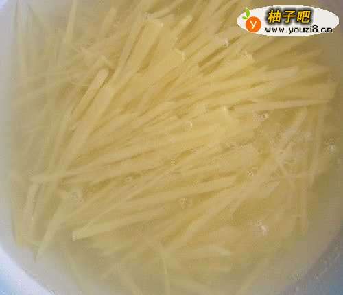 2将黄皮土豆去皮洗净,然后切成细丝,用凉水浸泡(用凉水将土豆丝多洗几遍,将土豆所含的淀粉洗没,直到洗的水清透为止)。
