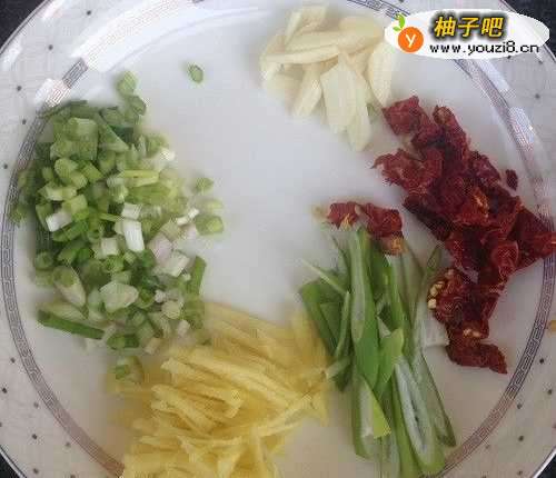 3将大葱洗净切丝;干红辣椒洗净切碎;蒜剥皮洗净切片;生姜去皮洗净切丝;香葱洗净切成葱末,全部装盘备用。