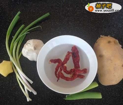 准备所需食材:黄皮土豆(土豆丝一次不要炒太多,家中一般的口锅就一个土豆就够了;而且炒土豆丝一定要选黄皮的土豆,这样口感更脆甜)、干红辣椒(提前用凉水发泡)、香葱、大葱、蒜、生姜等。