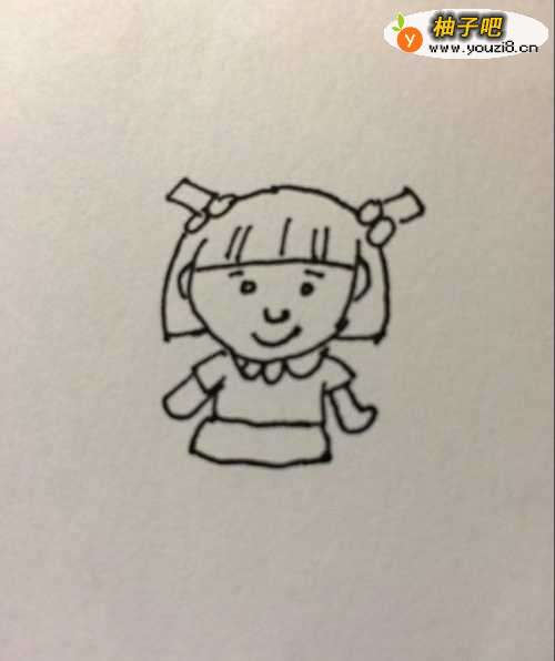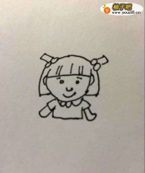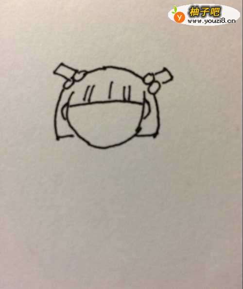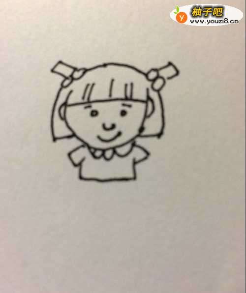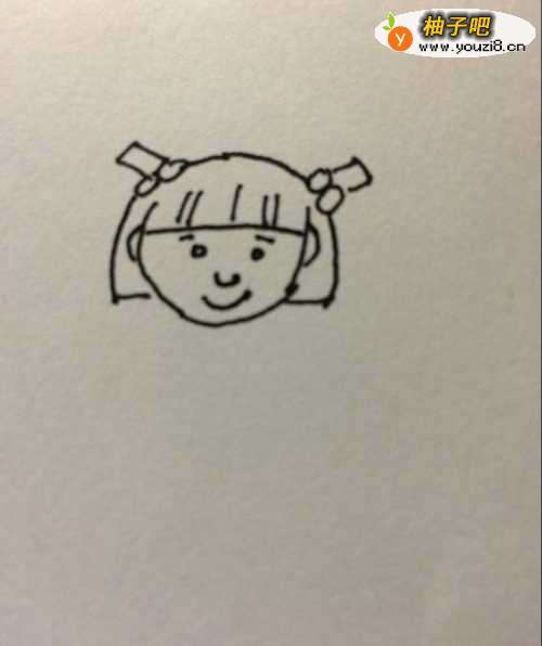 2首先画出小妹妹的头部,画2个小辫子和脸部。