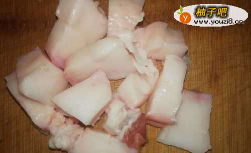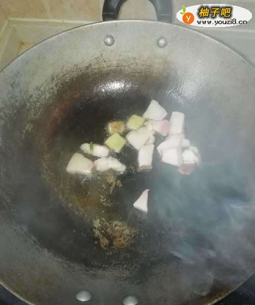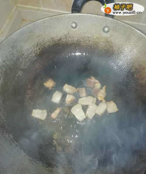 6将肉丁炒炼油,直到肉丁变成焦黄。