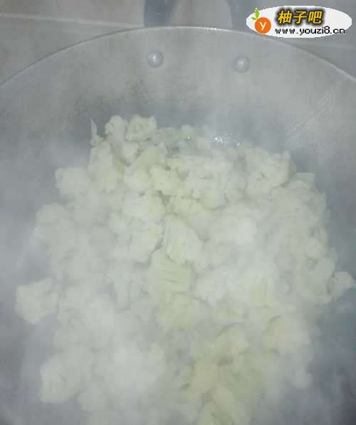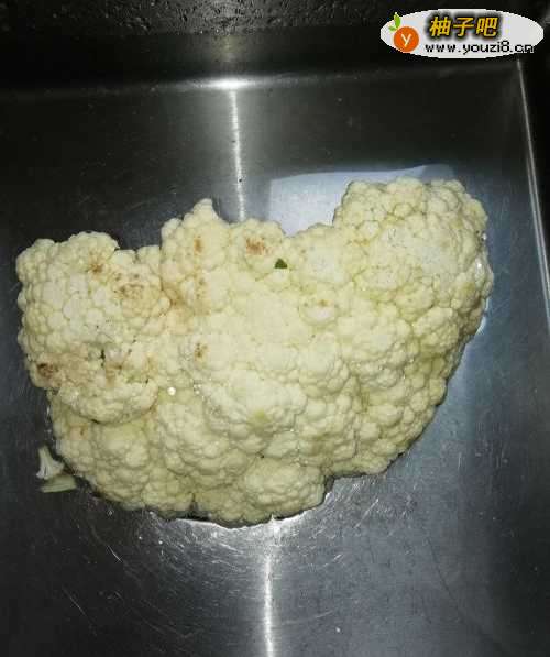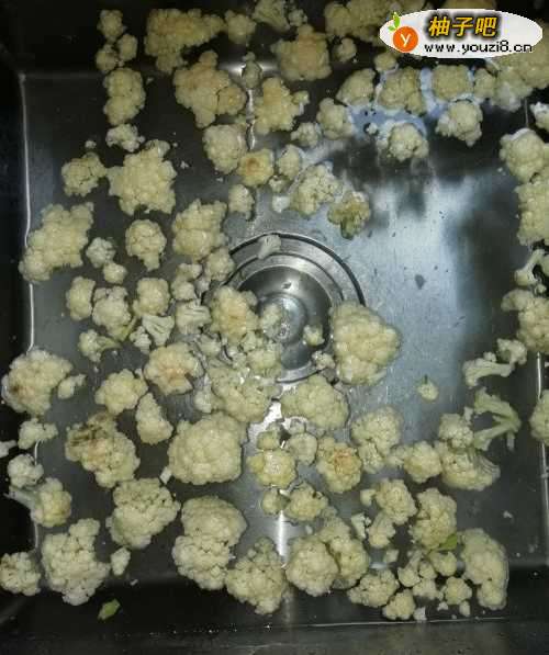2第二步就是清洗,将处理好的花菜用清水冲洗。之后,放入盆中,倒上清水,放入一点盐,浸泡30分钟。