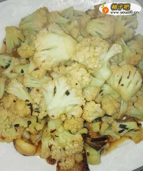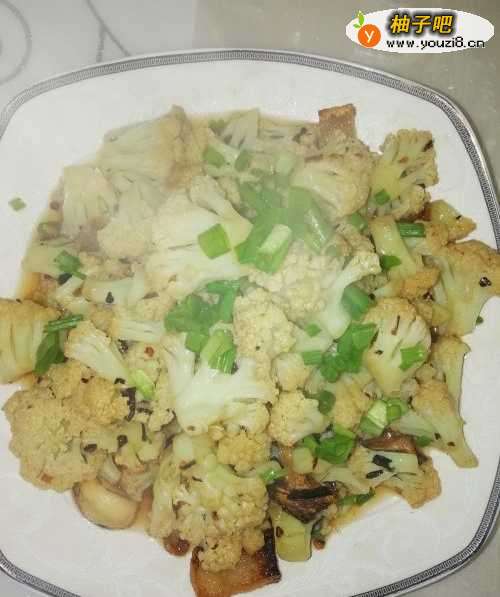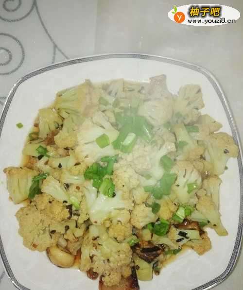 9大火炒3分钟左右,花菜缩水变软后,盛盘。撒上一些葱花,即可食用。