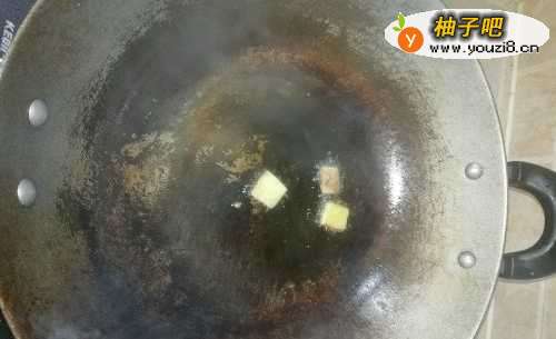 4点火将锅加热,倒入少量的植物油,加入姜片煸香。