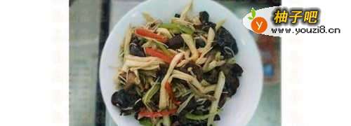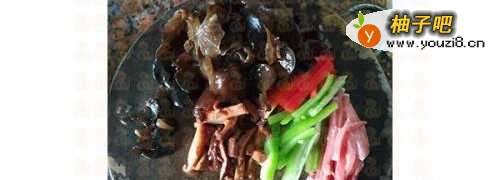 将泡发好的木耳洗净切小朵备用,香菇泡发好切丝备用,青辣椒红辣椒切丝备用,猪肉切丝备用。