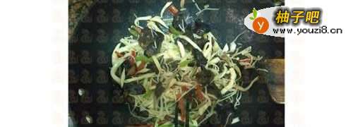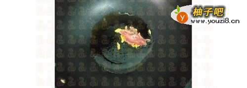 5冷油下锅至热,放入姜丝,加入猪肉翻炒微微变色。