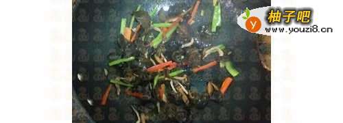 7倒入木耳翻炒,约2分钟,添加少许酱油继续翻炒至木耳7分熟。