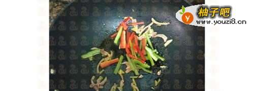 6接着加入红辣椒青辣椒翻炒1分钟。