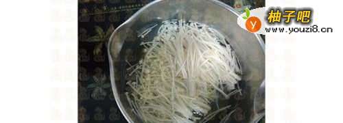 4金针菇去掉根部洗净,用热水焯一下金针菇,捞起冷水冲洗,沥干水备用。