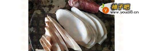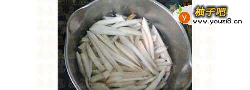 2将杏鲍菇洗净,斜切成片而后切丝备用。