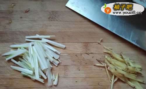 鱼蒸好后,去除盘中的水分,并切去除蒸过的葱姜丝。