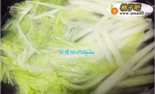 5白菜要在开水中多煮一会,只至菜茎全变软变透,要烫久一些,这样等下拌料的时候才会比较入味;将白菜丝用筷子捞出,放入佐料盘中快速的搅拌,让白菜均匀粘到佐料。