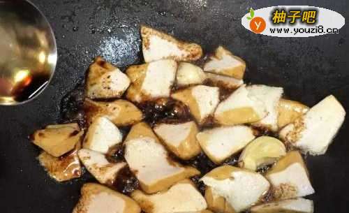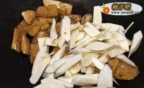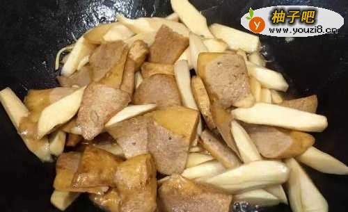 4待豆干表面裹上酱油后加入茭白及糖翻炒。