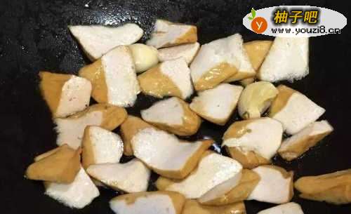2起油锅煸香豆干,表面煸至金黄后加入蒜头翻炒。