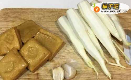 豆干切薄片,大蒜拍扁,茭白滚刀切块。
